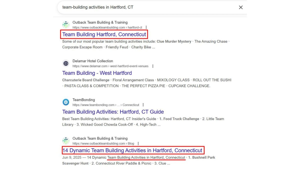 Let’s take the event industry and the keyword with the geographic modifier: “team-building activities in Hartford, CT.” You may notice Outback ranking twice in the top ten of the SERP, all thanks to optimized meta titles and descriptions for the local search.