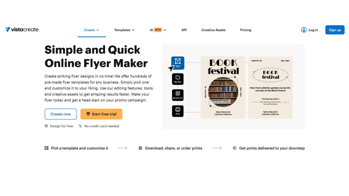 VistaCreate provides you with thousands of printable flyer templates online, which you can find easily. The interface is user-friendly and clean, making it easy to drag, drop, and customize your layout even if you are a first-time designer. You are also able to add pictures, pictograms and text boxes or create new images through the integrated AI image generator.